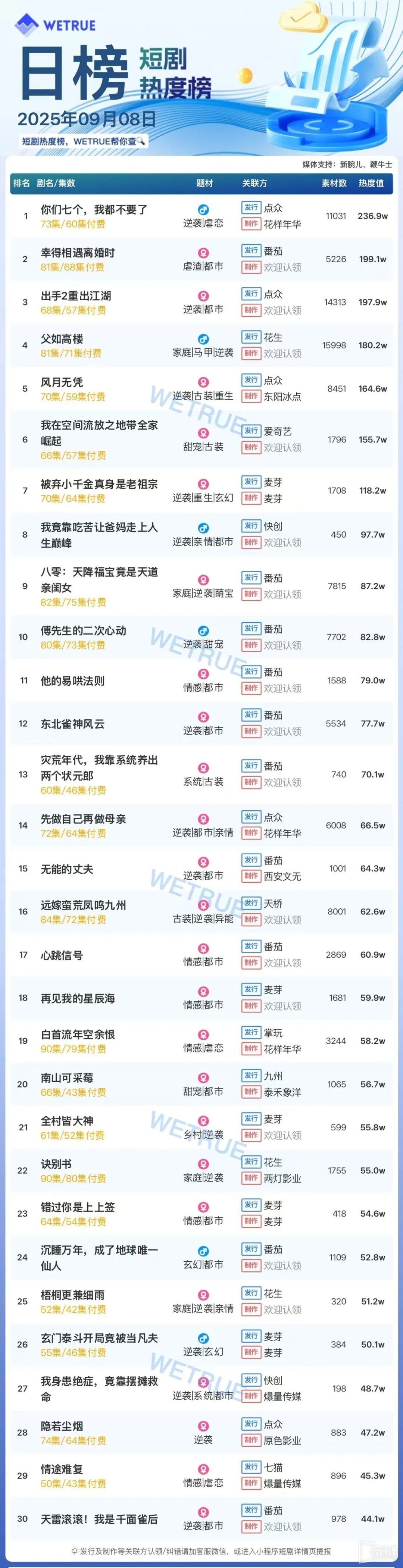 Website Disclaimer: The content of “September 8th Short Drama Popularity Ranking: Dianzhong《I don’t want any of you seven》Go to the top” on this site is provided by user "KaleidoscopeKing" and is for display purposes only. Copyright belongs to the original author. If your rights have been infringed, please contact us, and we will remove it as soon as possible.