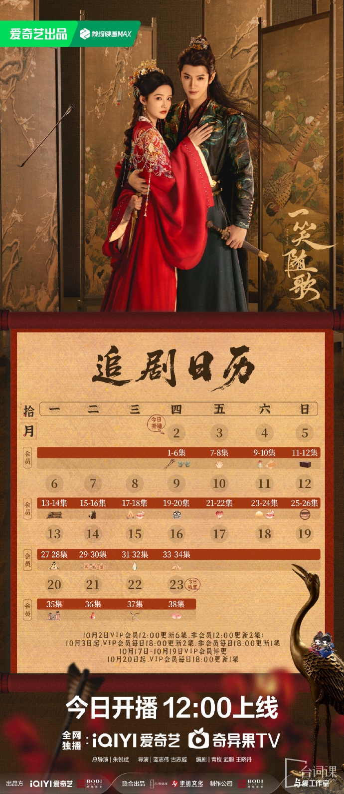 On October 2nd, 6 episodes will be updated at 12:00 for VIP members and 2 episodes will be updated at 12:00 for non-members.Starting from October 3rd, VIP members will update 2 episodes at 18:00 every day, and non-members will update 1 episode at 18:00 every day.VIP membership updates will be suspended from October 17th to October 19th.Starting from October 20th, one episode will be updated every day at 18:00 for VIP members.